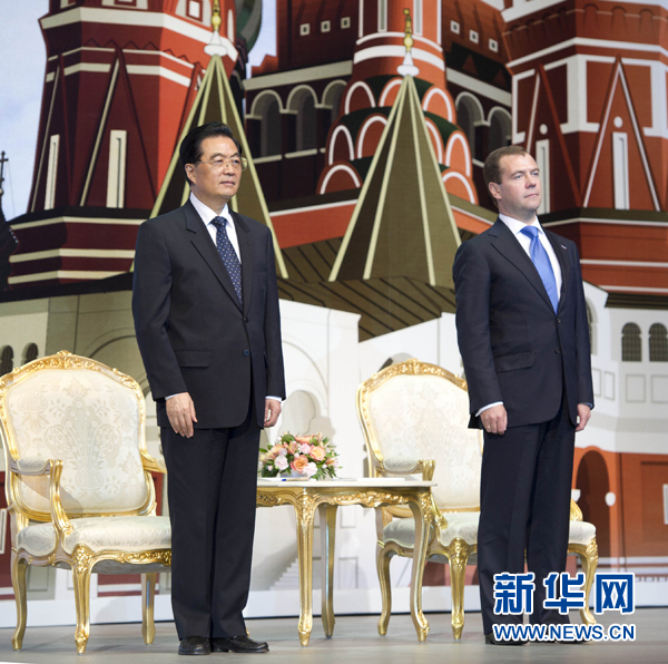 6月16日,中国国家主席胡锦涛和俄罗斯总统梅德韦杰夫在莫斯科共同出席《中俄睦邻友好合作条约》签署10周年庆祝音乐会并致辞。 新华社记者李学仁 摄
