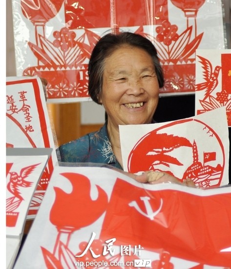 人民网沂源6月20日电 2011年6月20日,山东省沂源县南麻镇历山社区居委会64岁的庄成春老人在展示她的建党90周年剪纸。为喜迎党的90华诞,该老人从今年春天开始,围绕红色革命圣地、光辉的历程等系列建党内容,剪出了90幅“红色”剪纸,以此为建党90周年献礼。(赵东山/人民图片)