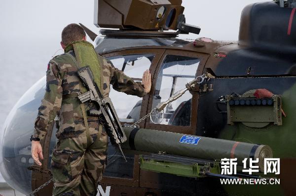 6月3日,在地中海海域的一艘法国“西北风”级两栖攻击舰上,一架武装直升机准备执行首次打击任务。新华社/路透