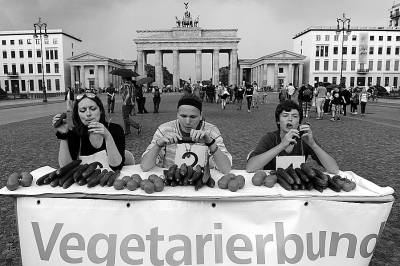 6月14日,德国素食主义协会在柏林勃兰登堡门前举办了一场别开生面的“吃黄瓜”大赛,参赛选手们狼吞虎咽,争当“黄瓜王”。德国宣布致命的大肠杆菌并不是来自于黄瓜,而是来自于受污染的豆芽菜。CFP供图