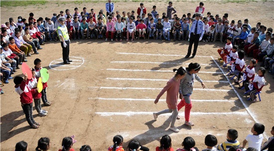 5月13日,“演员”在山东省临沂市郯城县马陵山景区清泉小学为师生表演“交通法规情景剧”。