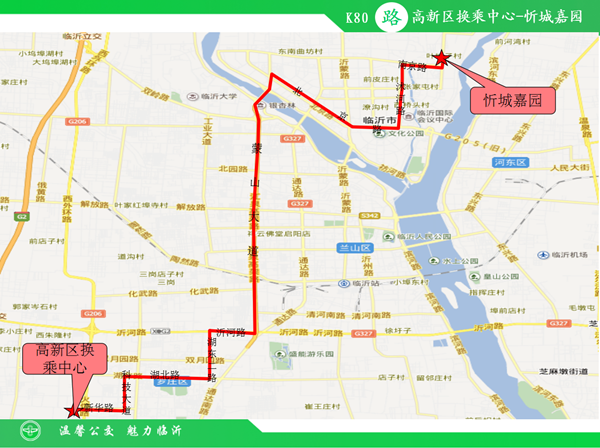 K80路公交线路由高新区换乘中心运行至忻城嘉园,线路途经高新区新华路、科技大道、湖北路、湖东二路、沂河路、蒙山大道、北京路、沭河路、南京路、温凉河路。