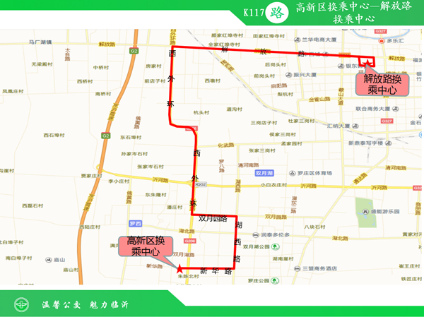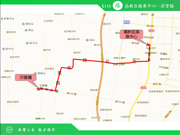 K116路公交线路由高新区换乘中心运行至罗庄区沂堂镇,线路途经高新区新华路、火炬路、文化路、泉重路、振兴大道。