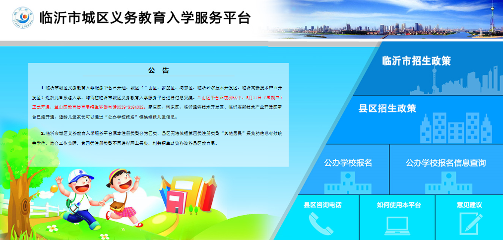 今年临沂城区中小学入学首次采用网上报名,4日,临沂市教育局正式开通城区义务教育入学服务平台(http://123.132.250.21:8081/),家长在申报学区内学校时,只要登录平台填写基本信息后,在各区规定的时间内便可查询到是否通过审核。由于兰山区平台还在测试中,所以该区的服务平台将推迟到5月11日开放。