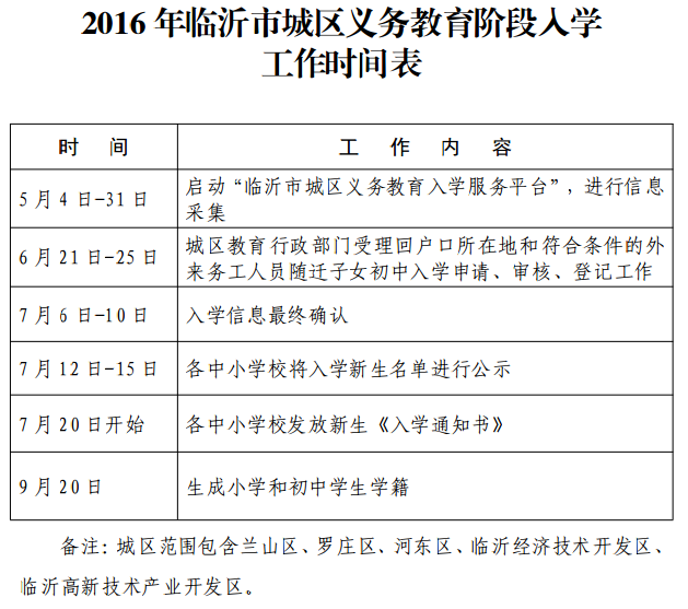 (一)凡年满 6 周岁(2010 年 8 月 31 日以前出生)拟在我 市入学的适龄儿童,均需参加学龄人口信息采集,免试划片入学,残疾儿童可适当推迟入学年龄。今年我市城区(兰山区、罗庄区、河东区、临沂经济技术开发区、临沂高新技术产业开发区)适龄儿童报名入学,均需在“临沂市城区义务教育入学服务平台”进行信息采集。有条件的县区,也可以使用此服务平台报名。市教育局直属义务教育阶段学校招生工作,由兰山区统一组织实施。