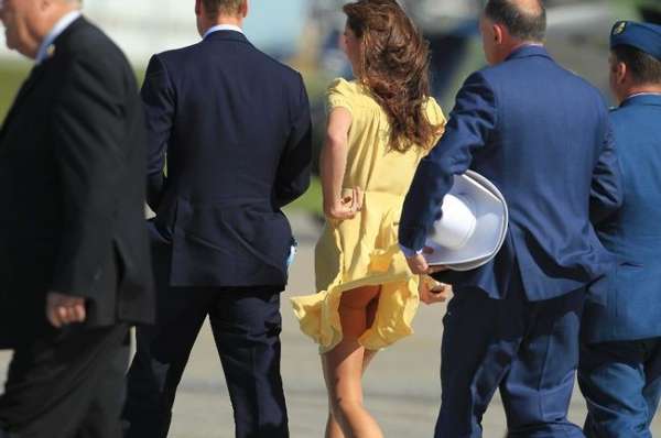 福尔热介绍,当时机场里刮的可算是“乱”风,王子夫妇大步流星直往前走。这时,一股邪风吹向众人,凯特的裙角被掀了起来。虽然她立即反手压了下去,但还是露出了裙底春光。从照片中甚至还可以看出,凯特穿着一双肉色的长筒袜。