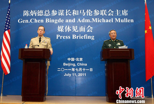 7月11日上午,中国人民解放军总参谋长陈炳德上将与美军参联会主席马伦海军上将,在北京举行会谈并共同会见中外记者。中新社发 宋吉河 摄