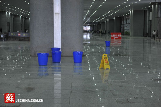 换乘大厅的顶部就是面积巨大的停车坪,按理说可以将雨水有效地隔离开。但是出现滴水的地方很多,记者现场竟数不过来。顶部具有装饰功能的白色横梁很多已经被泥水污染为黄色,一些地方的横梁已经断裂,或者干脆就没有了。工作人员在滴水集中的下方放置了5、6个大桶,尽量把漏水集中起来。