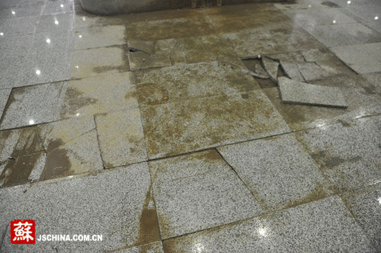 大理石地面在雨水的侵蚀下已经破裂。记者戚阜生摄
