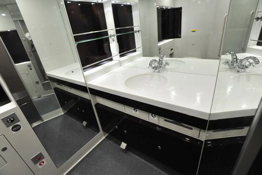 6月12日,一辆停靠在上海虹桥站正在试运行的京沪高铁CRH380A,其卫生间和餐车十分豪华。