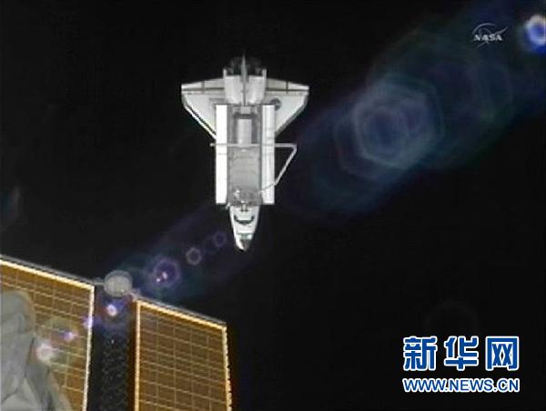 这张7月19日拍摄的美国宇航局视频截图显示,“阿特兰蒂斯”号航天飞机离开国际空间站,启程返回地球。 新华社/路透