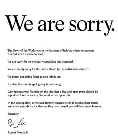 【默多克窃听风云】默多克在英国各大报纸刊登道歉信