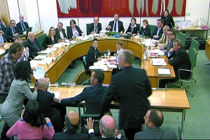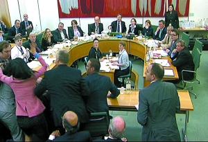 19日,在英国议会对默多克父子进行质询时,一男子(左一)手拿餐盘,企图袭击默多克。