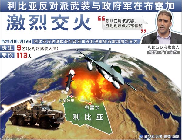 图表:利比亚反对派武装与政府军在布雷加激烈交火。 新华社记者 高微 编制