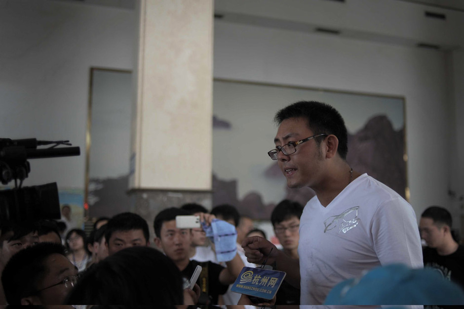 7月25日,确认妻子死讯后,杨峰情绪激动,站在凳子上向媒体讲述寻亲遭遇。7月23日晚,32岁的杨峰,身穿红色睡衣,在绍兴家中悠然自得地看着电视,心头不时牵挂着怀孕已7个月、人在旅途的妻子陈碧。但这平静的气氛在10点左右终止,一个霹雳击中了杨峰。妻子和岳父母、妻姐、外甥女5位亲属所乘坐的D3115次动车出事了!接到这个电话,杨峰的第一个反应就是开上车,拉上堂弟,从绍兴赶往温州,一路飞驰近4个小时,终于在凌晨时分来到这片遍地狼藉的现场。