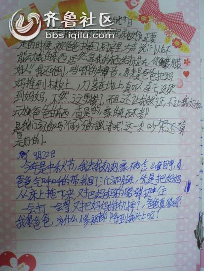 在第一篇日记中写道,“原来是爸爸为了逼妈妈离婚打的。我好害怕,希望他们快快好起来。爸爸真狠呀,妈妈不离就打妈妈。”之后,这部“离婚日记”又用大量篇幅描写父母吵架、父亲殴打母亲。