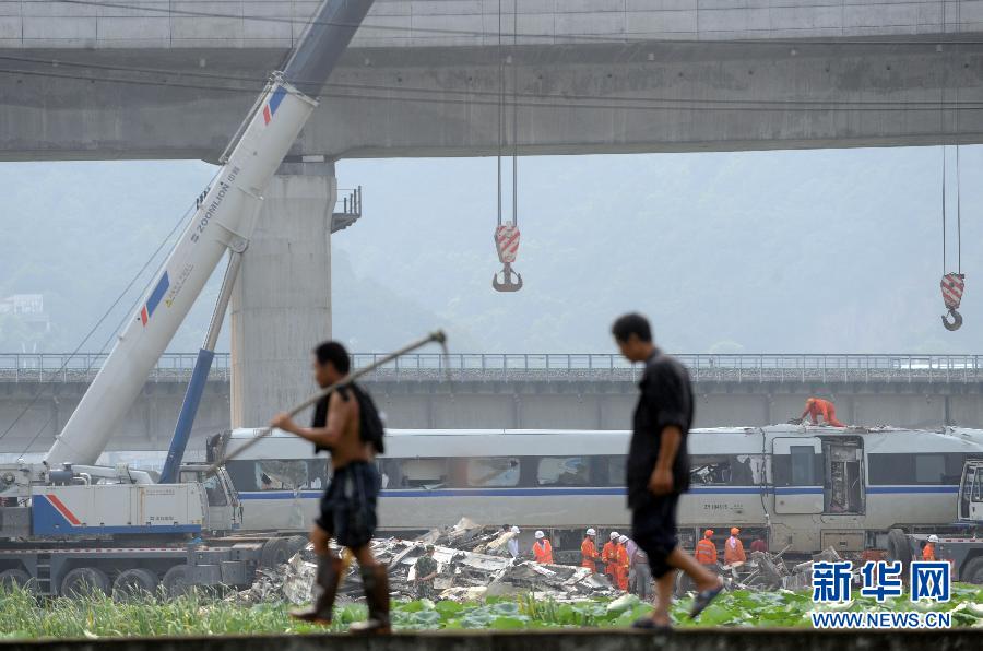 两位附近村庄的农民走过事故现场(7月26日摄)。 “7·23”甬温线特别重大铁路交通事故发生后,网帖《“7·23”动车事故的五点存疑》引发网民巨大关注,截至目前,该帖点击率已经超过27万人次,回复高达2209人次。 就网民关注的焦点问题,新华社“中国网事”记者对铁路部门工作人员和相关专家进行了采访。 新华社记者王定昶摄