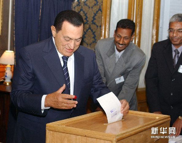图为穆巴拉克(左)2005年9月7日在开罗的一个投票站参加总统选举投票的资料照片。新华社发
