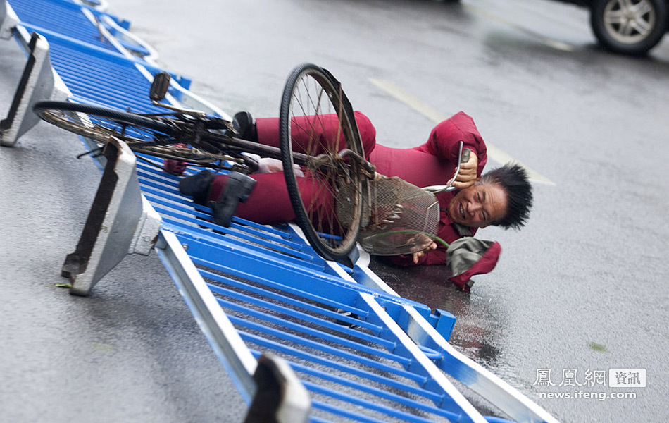 8月7日,台风“梅花”袭击江苏启东,骑行的市民被狂风吹倒。