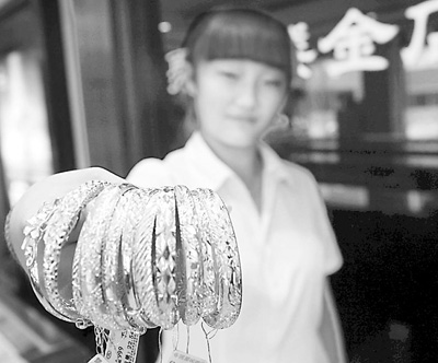 8月8日,在江苏省赣榆县一家金店,工作人员在展示黄金饰品。 司伟摄(新华社发)