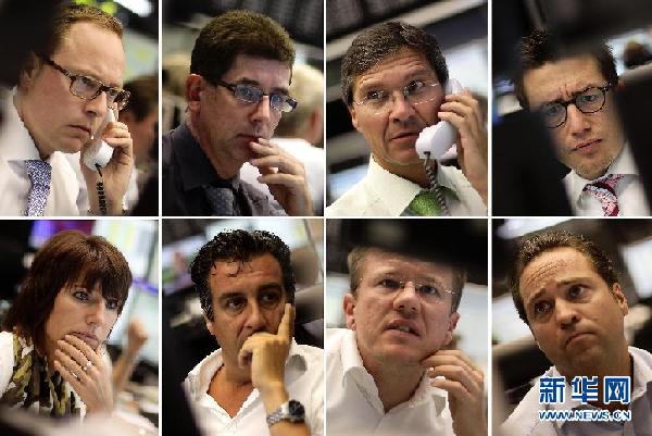 资料图片:这是8月8日在德国法兰克福证交所拍摄的交易员观看股市行情时的表情(拼版照片)。受美国主权信用评级下调和欧洲债务危机的影响,全球股市遭遇“黑色星期一”。 新华社/路透