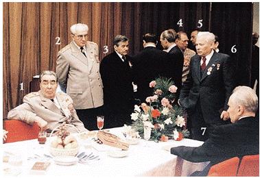 1975年,苏共政治局休息室。 图中:1.勃列日涅夫(时任苏共总书记);2.安德罗波夫;3.《真理报》主编;4.乌斯季诺夫;5.阿利耶夫;6.契尔年科;7.柯西金(资料图片)