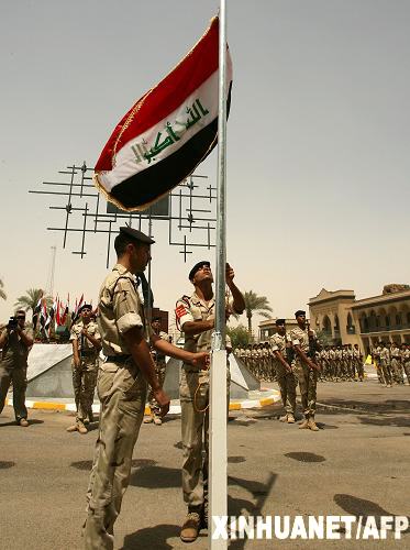 2009年6月29日,伊拉克士兵在美伊巴格达城安全控制权交接仪式上升旗。新华社/法新