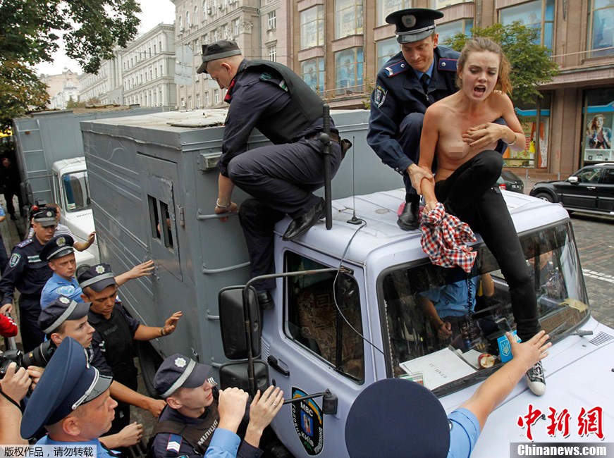 8月16日,乌克兰基辅,乌克兰著名主权组织“FEMEN”成员裸体抗议遭警察逮捕。FEMEN认为政府过于集中精力处置前总理季莫申科,而纵容社会上其它更多犯罪行为。乌克兰女权组织FEMEN以喜欢脱衣抗议而著名。