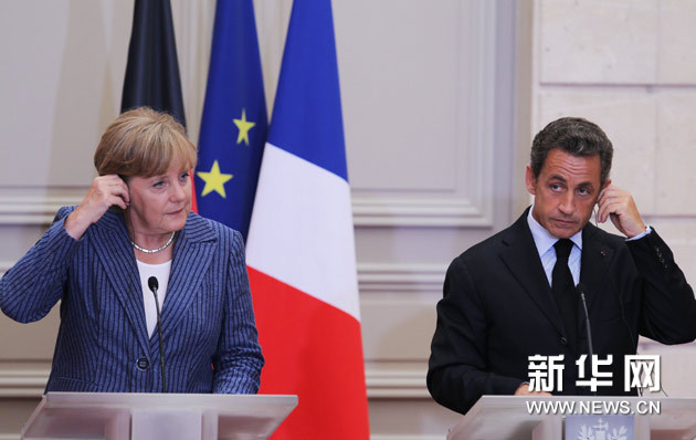 8月16日,法国总统萨科齐(右)与来访的德国总理默克尔在总统府爱丽舍宫出席联合记者招待会。新华社记者高静摄