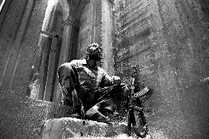 17日,一名反对派士兵正在躲避政府军的袭击。目前,利比亚反对派已经扫除了通向首都的最后一个障碍。