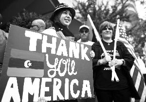 17日,利比亚反对派接管驻美大使馆,几名利比亚妇女打出横幅“感谢美国”。美国是较晚承认利反对派的西方国家。