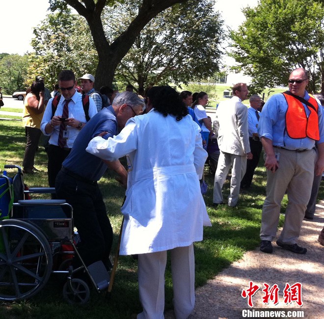 华盛顿时间23日下午(北京时间24日凌晨),美国弗吉尼亚地区发生里氏5.8级地震。地震发生时,弗吉尼亚周边的首都华盛顿、纽约等地均有明显震感。 白宫、五角大楼以及华盛顿所有的办公楼、医院、学校、博物馆紧急疏散。图为当日地震发生时,华盛顿国家广场附近的一家医院的医护人员紧急将病人疏散到安全地带。中新社发 吴庆才 摄