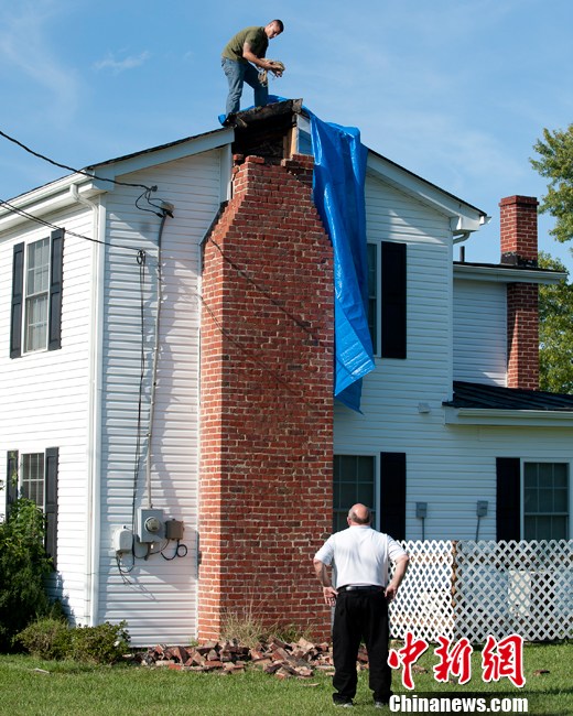 美国弗吉尼亚地区发生里氏5.8级地震。地震发生时,弗吉尼亚周边的首都华盛顿、纽约等地均有明显震感。 白宫、五角大楼以及华盛顿所有的办公楼、医院、学校、博物馆紧急疏散。图为弗吉尼亚州地震发生后,一名男子在整修因地震损坏的房屋烟囱。