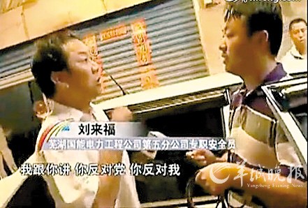 该视频为一则25日播出的新闻,因有人举报芜湖国能电力工程第五分公司强迫7名新员工交“份子钱”作奖金,又遭贪污,安徽电视台记者于是前往芜湖国能电力工程公司第五分公司进行调查采访,分公司原负责人孙庆云一见记者到来就躲进办公室不出来,记者准备离去时,该公司专职安全员刘来发刘来发(电视上称他为“刘来福”)突然冲了出来,要求记者下车接一个电话,遭记者拒绝后刘来发火冒三丈向记者怒吼:“你是不是党员?我跟你讲,你反对党,你反对我。”记者回答:“反对你就是反对党,是吧?”刘来发居然一口承认:“哎,就是!你对共产党员就这种态度啊?”这一过程被摄影机全程录下。