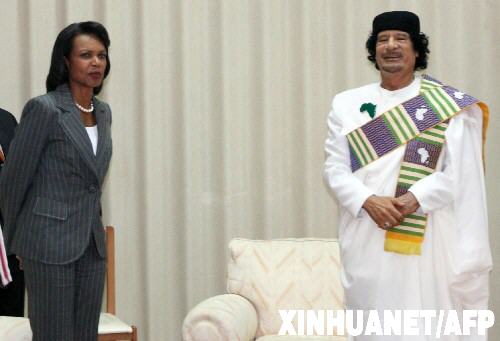 资料图:2008年9月5日,在利比亚首都的黎波里,利比亚领导人卡扎菲(右)会见到访的美国国务卿赖斯。这是半个多世纪以来第一位美国国务卿访问利比亚。 新华社/法新