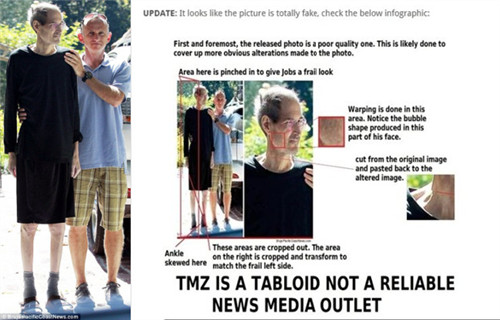 据苹果资讯论坛负责人奥马尔表示,这张照片是PS后的伪照。奥马尔指出,首先,照片清晰度很低,可能是有意遮掩PS痕迹;其次,照片左侧区域明显进行了拉长变形,有意让照片中的“乔布斯”更加瘦削;再次,乔布斯的右脸和颈部存在有明显的合成迹象,可能是头像移植的结果;最后,照片中乔布斯脚踝有扭曲的情况。另外,照片中的汽车并非乔布斯的座驾2006款奔驰SL55 AMG。