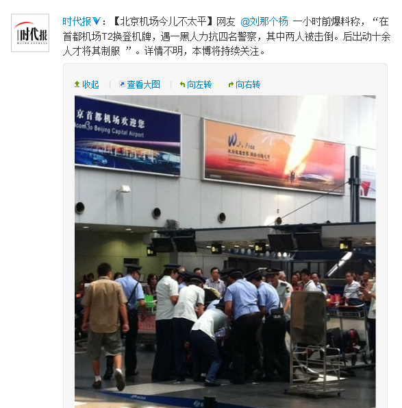 微博截图:一外籍乘客在首都机场发飙 与四名警察对打