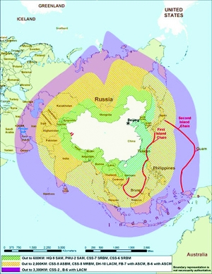 报告称,在更为传统的领域,中国的反介入/区域拒止战略侧重点似乎是,限制或控制敌方进入中国外围(包括西太平洋)的陆地、海洋和领空。如中国正获得并部署常规中程反舰弹道导弹,以拓展其可精确攻击海军舰艇目标的范围,包括在第一岛链外远离中国海岸行动的航空母舰。同时,中国正在发展远程版“獾”B-6 轰炸机,一旦升级版轰炸机配备远程对地攻击巡航导弹,其攻击半径便可远达第二岛链。