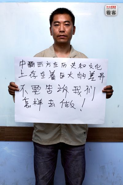 “中西方在历史和文化上存在着巨大的差异,不要告诉我们怎样去做。” 广西,Li Qi Sheng,30岁,来自辽宁的计算机科学教师,正在广西学英语。