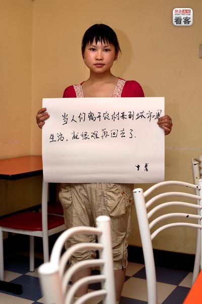 “当人们离开农村来到城市里生活,就很难再回去了。” 湖北,Song Jing Ping,22岁,来自于400公里外的农村,和她的未婚夫一起开两个小餐馆。