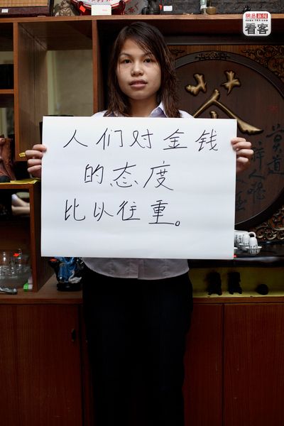 “人们对金钱的态度比以往重。” 广东,Su Dong Ping,22岁,在茶叶店工作。