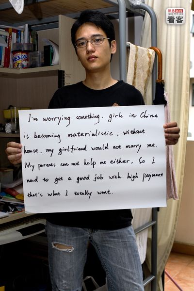 “我正在忧虑一些事情,中国的女孩正变得物质化。没有房子,我的女朋友就不会嫁给我。我父母也帮不了我,所以我想有个高收入的工作。这就是我想要的。” 广东,Rainbow Su,22岁,软件工程系学生。