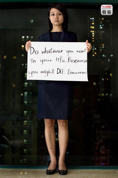 “做你生命中想做的事情,因为你可能明天就死掉了。” 香港,Sarah Yip,22岁,投资银行接待员。