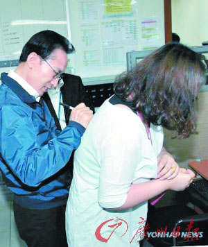 韩媒2日报道,韩国总统李明博访问了京畿道水原市一家电子设备公司。该公司一名女职员请求李明博在其衣服背部签名,结果成为网络热门话题。不少韩国网民讽刺称,李明博的行为是“性骚扰”。