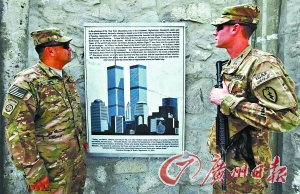 8月30日,在阿富汗东部贾拉拉巴德空军基地的两名美国特种兵观看“9·11”事件10周年纪念物。