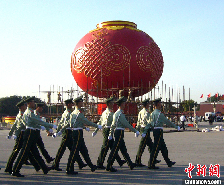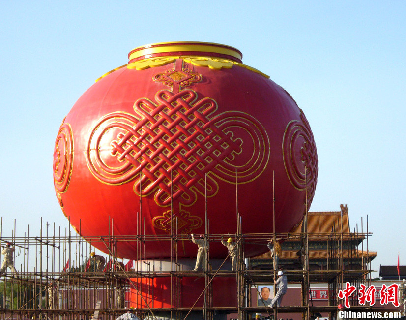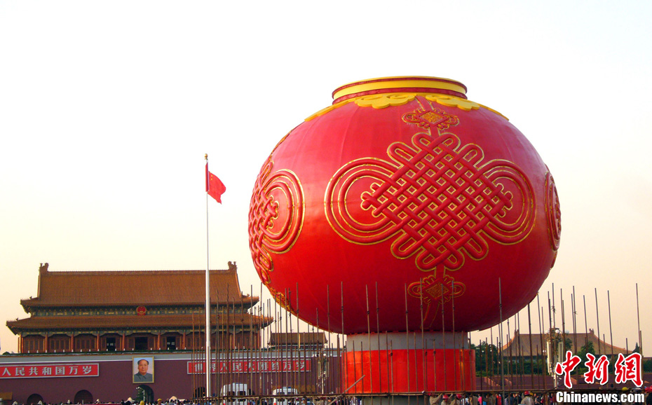 9月22日清晨,北京天安门广场上搭建的迎国庆巨型大红灯笼主体工程完工,吸引游人拍摄留影。2011年9月22日,北京天安广场迎国庆巨型大红灯笼主花坛,经过工人师傅们的连续奋战,在清晨5点50分,巨型大红灯笼上的装饰中国节灯管点亮,标志着巨型大红灯笼主体工程完工。李文明 摄 图片来源:CFP视觉中国