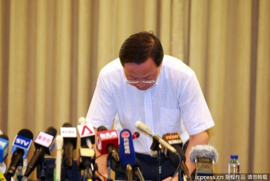 2011年9月27日20时30分,上海市政府新闻办召开地铁10号线追尾事故新闻通气会。申通地铁董事长俞光耀鞠躬致歉。图片来源:东方IC