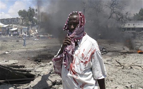 索马里首都摩加迪沙政府大楼发生爆炸,图为一名受伤的人站在爆炸现场。