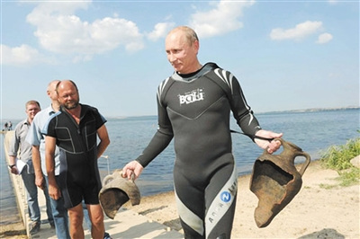 今年8月10日,普京在黑海海域附近的俄罗斯塔曼半岛潜水时,发现了两件6世纪时的古希腊陶罐,据悉这两件容器是用来装酒和橄榄油的。俄罗斯国家电视台对这一事件做了详细报道,录像中普京身着潜水服站在沙滩上,手中拿着两个陶罐兴奋地说,自己和随行人员在六尺之下的海水中发现了这两件珍品。