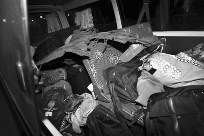 一辆停放在滨保高速入口的面包车上装满了遇难者的遗物,包括书包、电脑包以及爆裂的轮胎残骸。